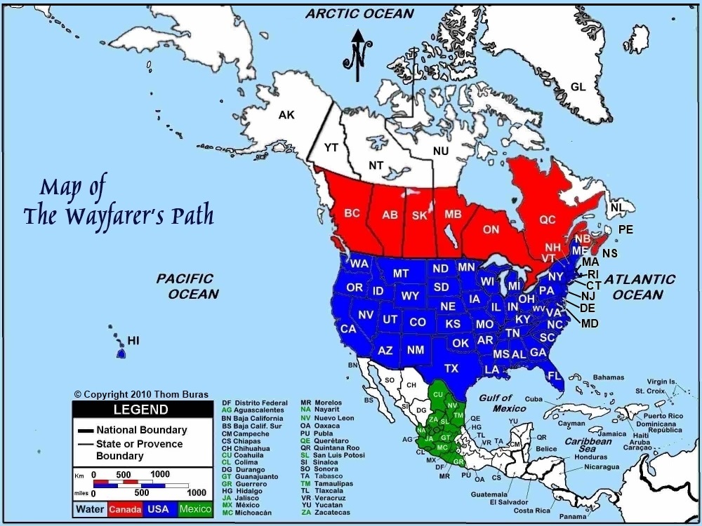 Path showing all of the states and provinces that I have journeyed through. Finally, I retire to my van, cook my supper and prepare for tomorrow′s meeting.(Day 37)